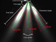 Cambiando punto di vista e illuminando la sezione dello spray con una lama di luce laser si può determinare l'are di distribuzione delle densità nonchè le coordinate del centro dello spray